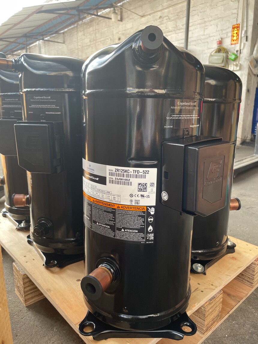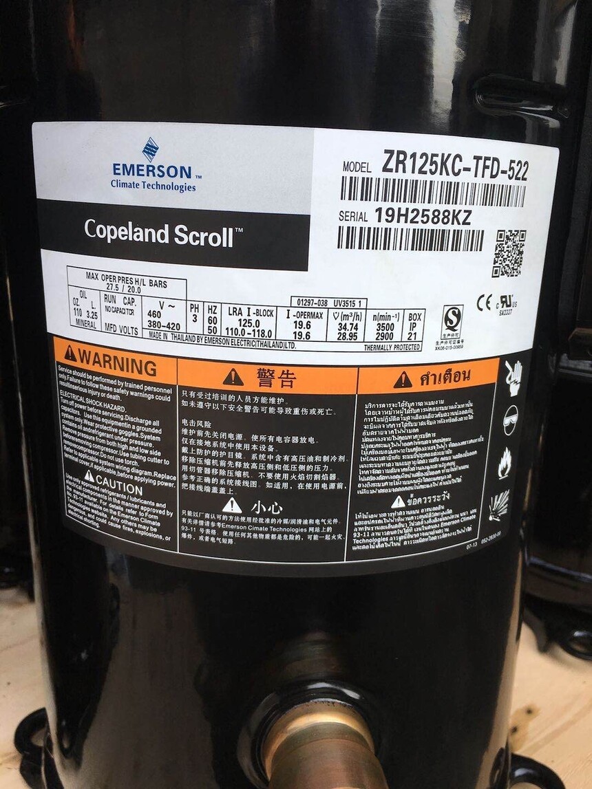 Copeland Compressor - Model ZR125KC-TFD-522 Cooling Capacity (BTU/H): 104,600 Horsepower (HP): 10,000 Rated Load Amps (RLA): 19.2 Locked Rotor Amps (LRA): 125.0 Refrigerant: R22 Power Supply: 380-420V/3P/50Hz
